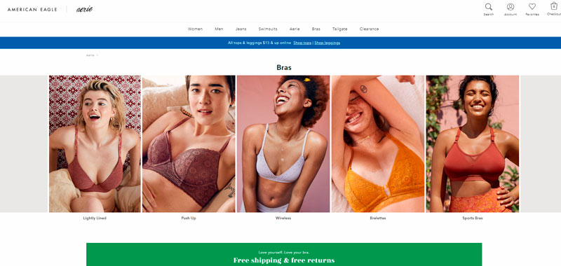 Si buscas lencería básica asequible y bien producida que se pueda usar todos los días, prueba Aerie. Esta es una rama de la marca American Eagle, enfocada en lencería, ropa de dormir y natación. Los elementos básicos de Aerie son perfectos para el uso diario, ya que te brindan la sensación de estar allí sin dejar de brindar apoyo en todos los lugares correctos. La colección incluye sostenes, bralettes, calzoncillos, correas y ropa interior. Como punto aparte, la marca se enfoca en el empoderamiento de la mujer y escoge modelos de diferentes tamaños, pesos y etnias, sin usar retoques fotográficos, de manera que todas las mujeres puedan identificarse con personas reales.