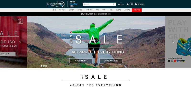 En Sportshoes.com consigues ofertas de saldo desde el 40 al 74% de descuento en marcas tan importantes como Adidas, Asics, Merrel, New Balance, Mizuno, Under Armour y más. Y aunque la tienda no está en Estados Unidos, sus precios son tan interesantes que es bueno tenerla en cuenta. Su tiempo de entrega para Estados Unidos es de 5 a 7 días laborales en el servicio Express ($37,50) o de 10 a 14 días laborales en el servicio Estándar ($5.99) para pedidos de hasta 1 kg de peso (no incluye posibles impuestos). Si el valor de tu compra es mayor de $50 el costo del envío estándar baja a $1.99.