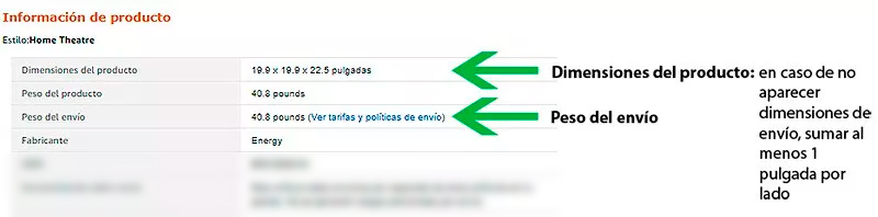 Lo que tienes que hacer es buscar la “Información del Producto”. Allí te aparecen las dimensiones y el peso. Lo ideal es que te aparezcan las dimensiones en pulgadas y el peso en libras. Si no es el caso solo tienes que usar un convertidor cualquiera de los que aparecen en la web para convertir las medidas y el peso correcto.
