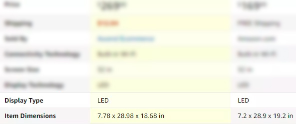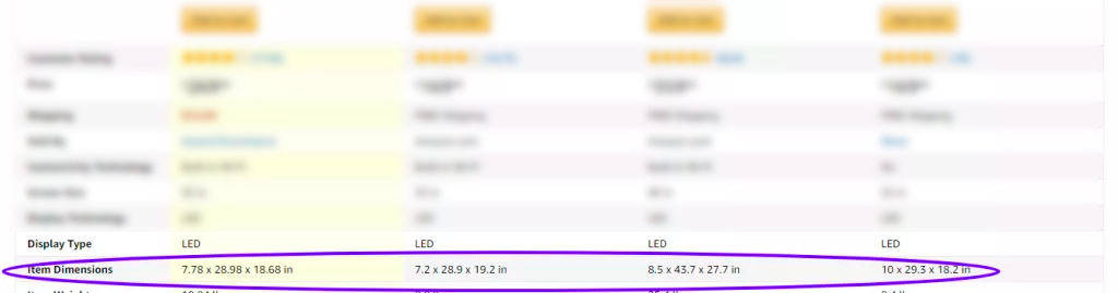 A pesar que el “Item Dimension” son las dimensiones del televisor sin la caja, se puede estimar de 1 a 2 pulgadas adicionales para calcular el envío, por ejemplo la medidas del primero son. 7.78 x 28.98 x 18.68 todo esto es en pulgadas, esta información es básica para poder calcular todo, también es necesario conocer el peso en este caso es de 10.84 lbs.