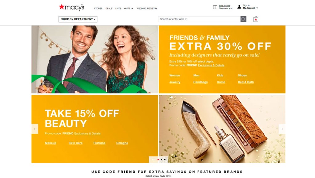 En Macy’s encuentras de todo y con ofertas de Black Friday ya disponibles. Tienen un 30% usando el código FRIEND en artículos para damas, caballeros, niños, zapatos, joyas, bolsos, etc. También tienen 15% en artículos de belleza, maquillaje, perfumes y hasta un 60% en muebles, cobijas y más. Buen momento par visitar este sitio y revisar que te gusta.
