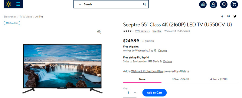 Sceptre 55" Class 4K (2160P) LED TV (U550CV-U), Oferta Walmart $249.99