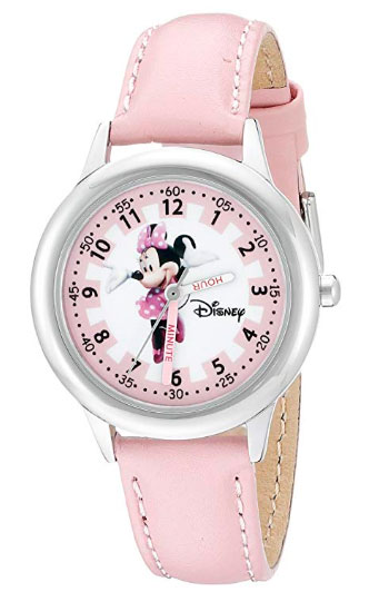 Con diseño de Minnie Mouse, para aprender la hora, de acero inoxidable y con correa de piel rosa. Recomendado para niños de 3 a 7 años. Resistente al agua hasta a 99 pies: resiste a la lluvia y a salpicaduras de agua, pero no es adecuado para la ducha o para sumergirse.