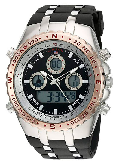 Reloj analógico-digital negro, con banda de silicona con enlaces de tono plateado, y bisel dorado/cobrizo claro. Movimiento de cuarzo. Diámetro de la carcasa: 48 mm. No resistente al agua.